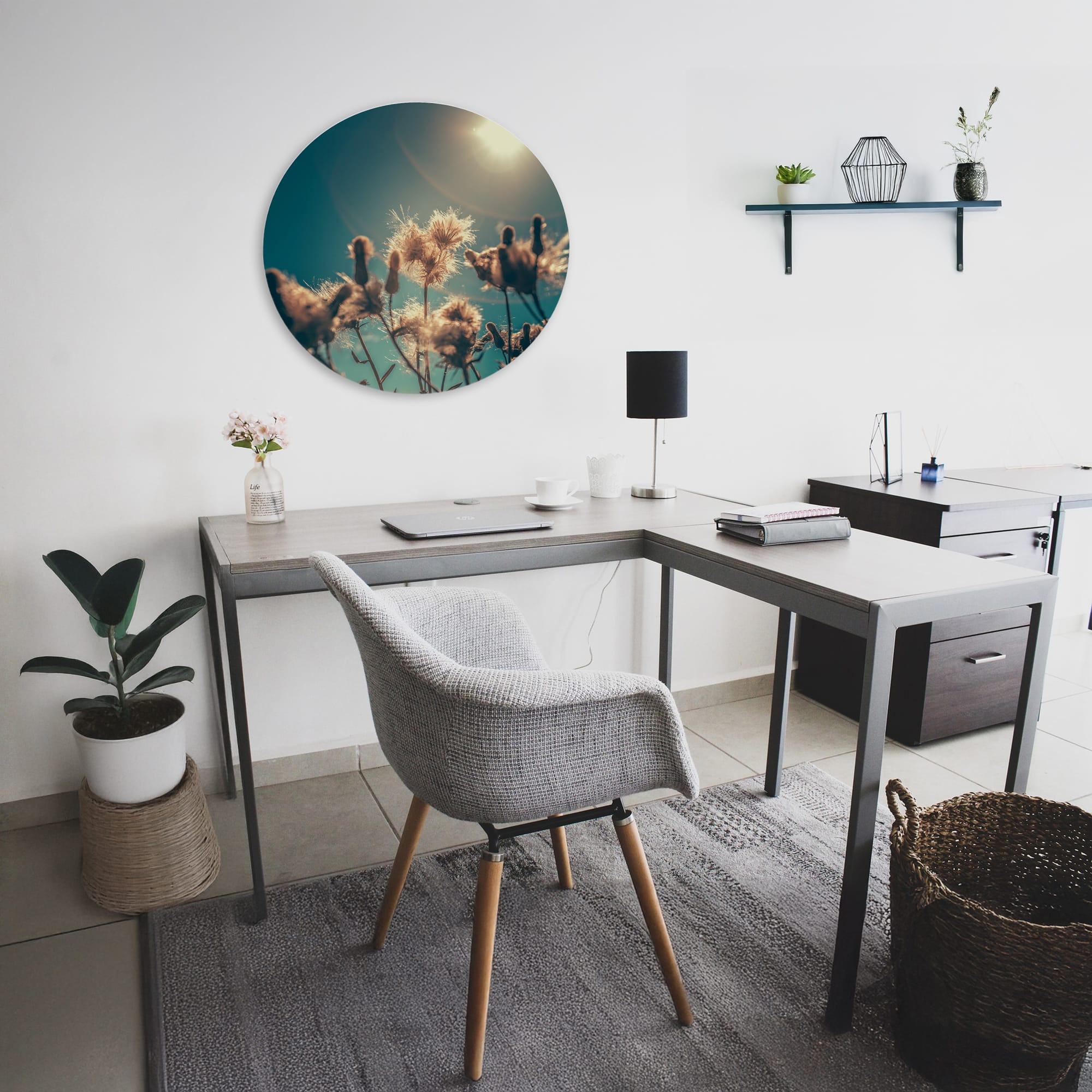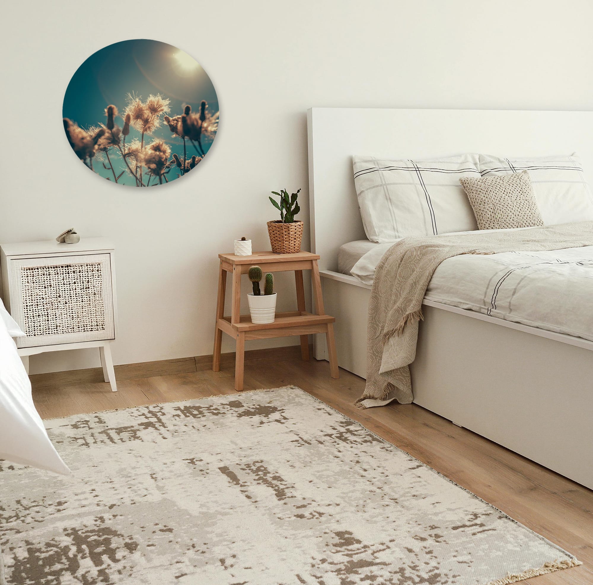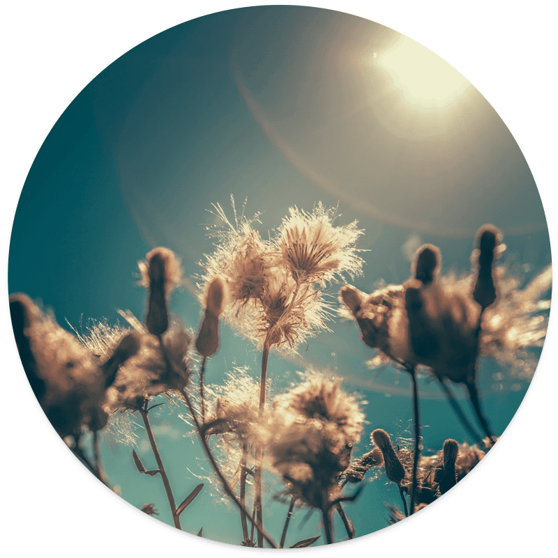 Haal het zonnetje in huis met de muurcirkel foto ‘Sunny Vibes’. Deze prachtige afbeelding van bloemen die baden in het zonlicht tegen een strakke blauwe lucht straalt pure energie en positiviteit uit. Perfect voor wie zijn interieur wil verrijken met een zomerse en levendige sfeer.